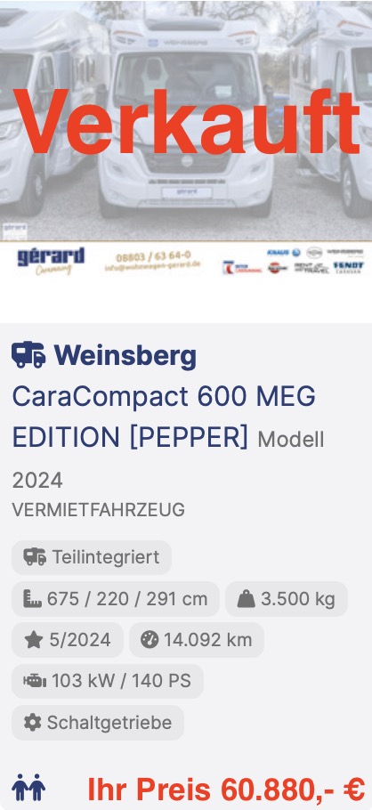 Ob kompakter Kastenwagen, Wohnwagen oder komfortables Reisemobil – unsere Fahrzeuge sind sofort startklar für neue Abenteuer. Schauen Sie sich unsere Auswahl an und finden Sie das Modell, das zu Ihnen passt.